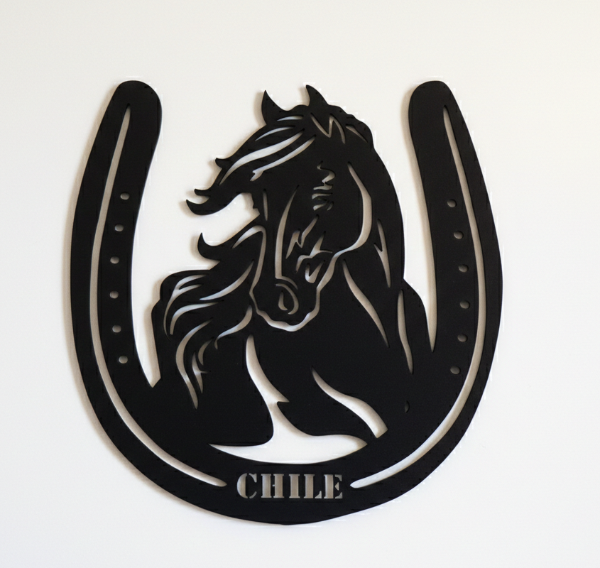 Figura decorativa en forma de caballo y herradura con la palabra «Chile»